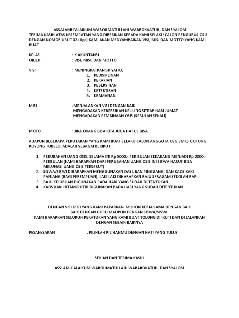 Contoh visi & misi osis sebuah contoh visi dan misi menjadi pengurus osis : Latihan dasar kepemimpinan / ldk adalah sebuah pelatihan dasar tentang segala hal yang berkaitan dengan kepemimpinan. Insya allah, jika saya menjadi ketua osis, saya akan membuat perubahan yang besar pada sekolah ini, mulai dari kebersihan, kerapian, hingga kedisiplinan. Menjadikan osis sebagai sarana penampungan kreativitas, inspirasi dan aspirasi, juga meningkatkan sekolah sebagai sekolah yang bermutu, berani tampil beda, jujur, berakhlak mulia, adil, dan disiplin. Alasan dan motto untuk menjadi ketua osis insya allah, jika saya menjadi ketua osis, saya akan membuat perubahan yang besar pada. Osis mulai diterapkan mulai dari pendidikan tingkat smp, sma, dan smk. Seluruh anggota osis berhak untuk memilih calonnya untuk kemudian menjadi pengurus osis. Xi ipa 4 alamat : Dalam upaya mengenal, memahami dan mengelola osis perlu kejelasan mengenai pengertian, tujuan, fungsi, dan struktur osis. Kemampuan public speaking pada anggota osis sma n 1 dempet. Motto hidup singkat juga biasanya mengandung makna yang lebih mendalam dan bisa dijadikan sumber semangat diri dalam menjalani hidup. Isi saat proses sosialisasi dikelas para calon ketua osis telah memberi tahu kepada seluruh anggota kelas tentang visi misinya. Pidato di bawah dalam dua bahasa yaitu inggris dan indonesia.